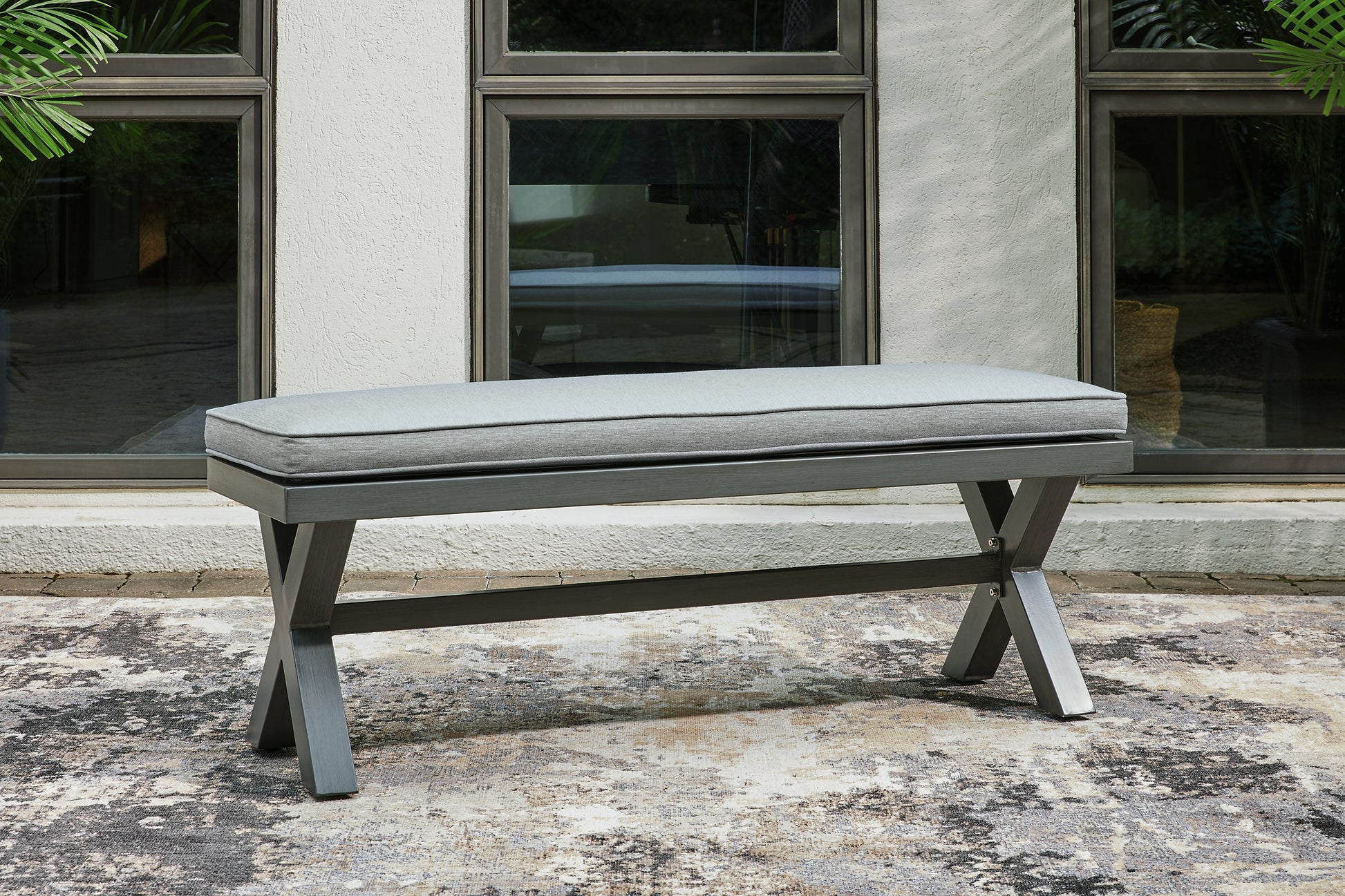 Add a distinguished touch of gray to your outdoor living space with this bench. It's made with an aluminum frame with a wood-look finish for a relaxed feel that provides seasons of enjoyment. Rest assured, the thick seat cushion is wrapped in Nuvella® high-performance fabric that’s fade-resistant, stain-resistant and a breeze to clean.