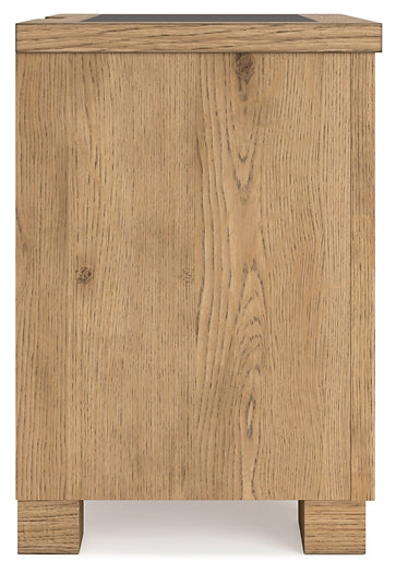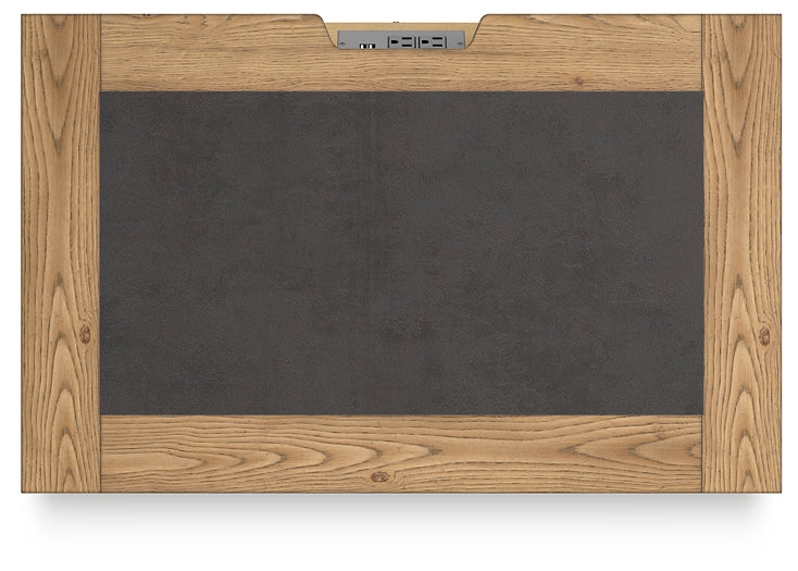 Details | Made with hardwood solids and thick rustic oak veneer, Glazed natural light oak color finish enhances the natural characteristics of the veneer, Top with cement tile inlay, Thick metal bar pulls with a hammered textural surface in an aged bronze-tone finish, 2 drawers with fully finished interior, dovetail construction and ball-bearing side glides, 110V power supply with dual USB charging ports, Natural wood may display natural weathering, unique cracks, splits, knots, saw marks or other organic features unique to each piece, Power cord included; UL Listed | |